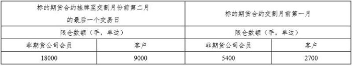 非期貨公司會(huì)員和客戶持有的某月份期權(quán)合約所有看漲期權(quán)的買持倉量和看跌期權(quán)的賣持倉量之和、看跌期權(quán)的買持倉量和看漲期權(quán)的賣持倉量之和,分別不得超過下表所示的持倉限額。
