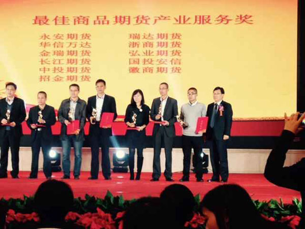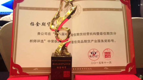 2015年11月13日,在由《證券時報》、《期貨日報》聯(lián)合主辦的“第八屆中國最佳期貨經(jīng)營機構(gòu)暨最佳期貨分析師評選”中,招金期貨榮獲“中國最具成長性期貨公司”、“最佳資產(chǎn)管理業(yè)務(wù)獎”、“最佳商品期貨產(chǎn)業(yè)服務(wù)獎”、“中國期貨優(yōu)秀營業(yè)部-招金期貨有限公司臨沂營業(yè)部”稱號,同時招金期貨分析師李曉杰、袁帥榮獲“最佳工業(yè)品期貨分析師”,這是業(yè)界對招金期貨近幾年快速發(fā)展的高度褒獎。 據(jù)悉,"中國最佳期貨經(jīng)營機構(gòu)暨最佳期貨分析師評選"已成功舉辦八屆,是國內(nèi)設(shè)立最早、行業(yè)中最權(quán)威和最具影響力的評選活動.