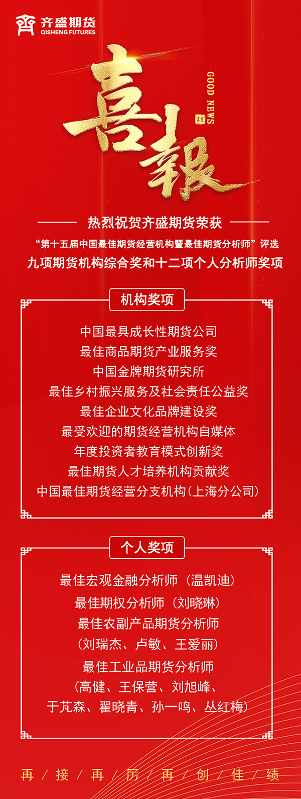 近日,由《證券時報》、《期貨日報》聯(lián)合主辦的“第十五屆中國最佳期貨經(jīng)營機構(gòu)暨最佳期貨分析師評選”活動中,山東齊盛期貨有限公司榮獲“中國最具成長性期貨公司”、“最佳商品期貨產(chǎn)業(yè)服務獎”、“中國金牌期貨研究所”、“最佳鄉(xiāng)村振興服務及社會責任公益獎”等九項期貨機構(gòu)綜合獎和十二項個人分析師獎項。 據(jù)悉,"中國最佳期貨經(jīng)營機構(gòu)暨最佳期貨分析師評選活動"已成功舉辦了十五屆,是國內(nèi)設立最早、期貨行業(yè)中最具權(quán)威和影響力的評選活動。