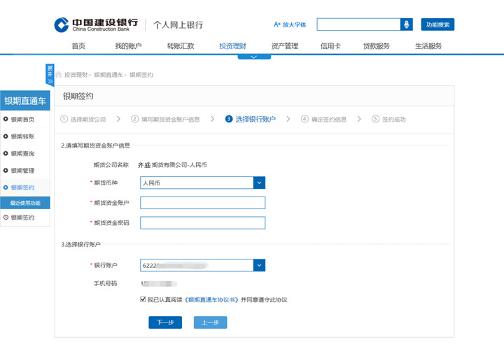 輸入期貨賬號(hào)、資金密碼等信息后,勾選“我已確認(rèn)閱讀“,點(diǎn)擊下一步。