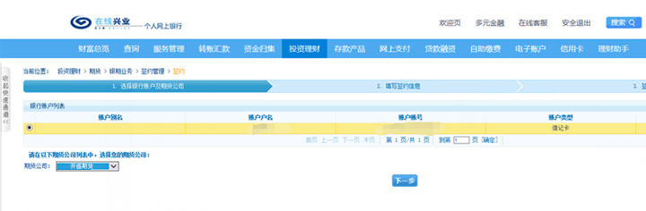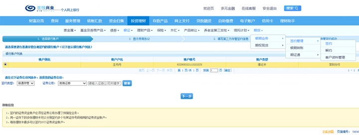 選擇“投資理財”-“銀證”-“期貨”-“銀期業(yè)務(wù)”-“簽約管理”-“簽約”。