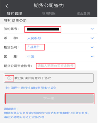 在期貨公司簽約頁面中簽約賬號下拉框中選擇需要簽約的賬號-期貨公司選擇:“齊盛期貨”-期貨公司資金賬號:“輸入資金賬號”-選擇我已閱讀并同意以下協(xié)議并按確認(rèn)進(jìn)行簽約。。