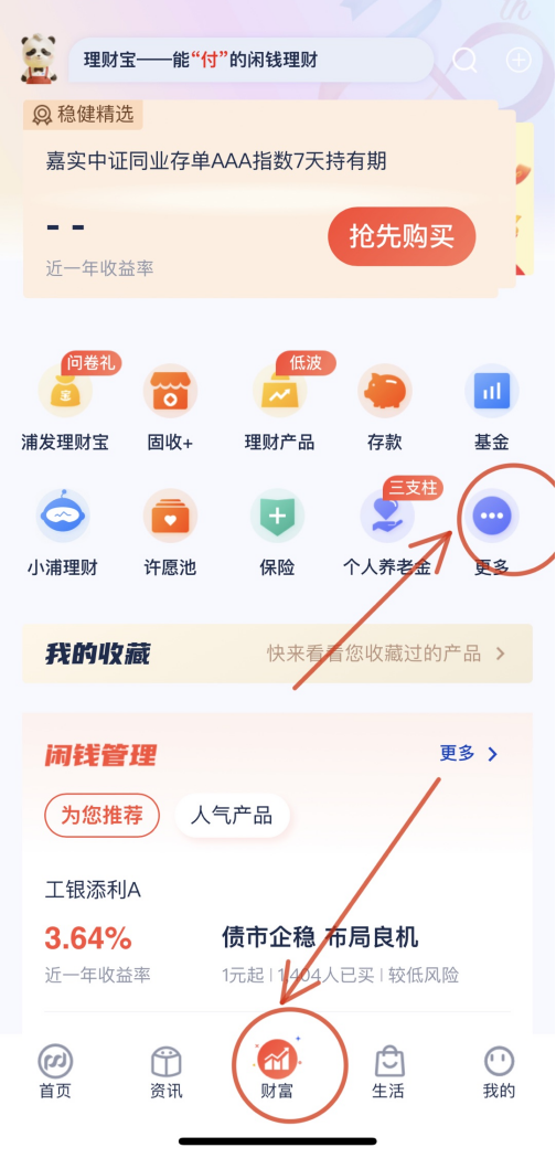 登錄浦發(fā)銀行APP,點(diǎn)擊財(cái)富-更多